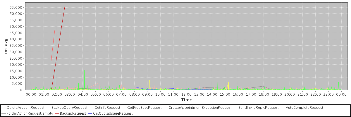 avg(DeleteAccountRequest) = 24451.33 avg(BackupQueryRequest) = 841.80 avg(GetInfoRequest) = 424.77 avg(GetFreeBusyRequest) = 427.01 avg(CreateAppointmentExceptionRequest) = 381.00 avg(SendInviteReplyRequest) = 439.00 avg(AutoCompleteRequest) = 522.15 avg(FolderActionRequest.empty) = 566.06 avg(BackupRequest) = 33351.00 avg(GetQuotaUsageRequest) = 1508.00