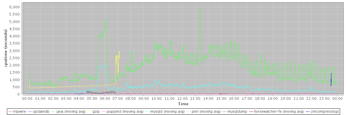avg(tripwire) = 1472.00 avg(updatedb) = 25.00 avg(java) = 1869.12 avg(gzip) = 2195.76 avg(puppetd) = 11.39 avg(mysqld) = 426.09 avg(perl) = 19.90 avg(mysqldump) = 113.45 avg(horsewatcher-fe) = 17.33 avg(zmcompresslogs) = 935.25