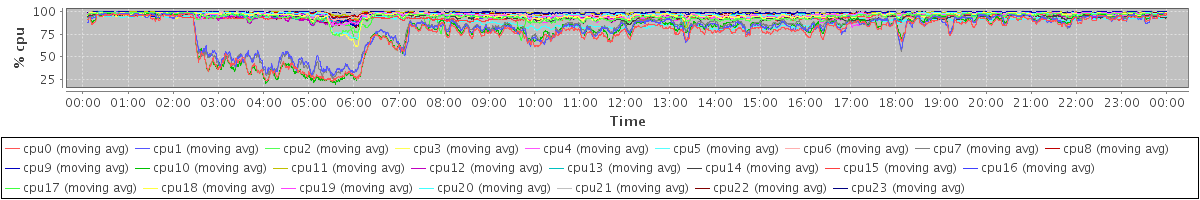 avg(cpu0) = 0.13 avg(cpu1) = 0.12 avg(cpu2) = 0.08 avg(cpu3) = 0.09 avg(cpu4) = 0.09 avg(cpu5) = 0.07 avg(cpu6) = 0.02 avg(cpu7) = 0.05 avg(cpu8) = 0.01 avg(cpu9) = 0.02 avg(cpu10) = 0.04 avg(cpu11) = 0.01 avg(cpu12) = 0.01 avg(cpu13) = 0.01 avg(cpu14) = 0.05 avg(cpu15) = 0.04 avg(cpu16) = 0.04 avg(cpu17) = 0.07 avg(cpu18) = 0.03 avg(cpu19) = 0.04 avg(cpu20) = 0.06 avg(cpu21) = 0.00 avg(cpu22) = 0.01 avg(cpu23) = 0.00