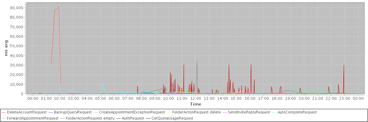 avg(DeleteAccountRequest) = 55234.25 avg(BackupQueryRequest) = 577.40 avg(CreateAppointmentExceptionRequest) = 418.59 avg(FolderActionRequest.delete) = 1142.88 avg(SendInviteReplyRequest) = 441.63 avg(AutoCompleteRequest) = 412.33 avg(ForwardAppointmentRequest) = 1836.00 avg(FolderActionRequest.empty) = 1667.73 avg(AuthRequest) = 482.77 avg(GetQuotaUsageRequest) = 1428.00