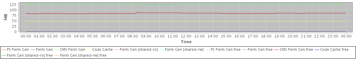 avg(PS Perm Gen) = 0.00 avg(Perm Gen) = 0.00 avg(CMS Perm Gen) = 126.67 avg(Code Cache) = 47.53 avg(Perm Gen [shared-ro]) = 0.00 avg(Perm Gen [shared-rw]) = 0.00 avg(PS Perm Gen free) = 0.00 avg(Perm Gen free) = 0.00 avg(CMS Perm Gen free) = 84.89 avg(Code Cache free) = 0.41 avg(Perm Gen [shared-ro] free) = 0.00 avg(Perm Gen [shared-rw] free) = 0.00