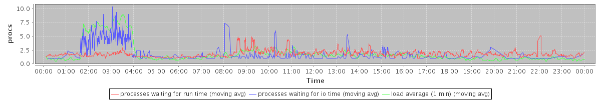 avg(processes waiting for run time) = 1.10 avg(processes waiting for io time) = 0.73 avg(load average (1 min)) = 1.86