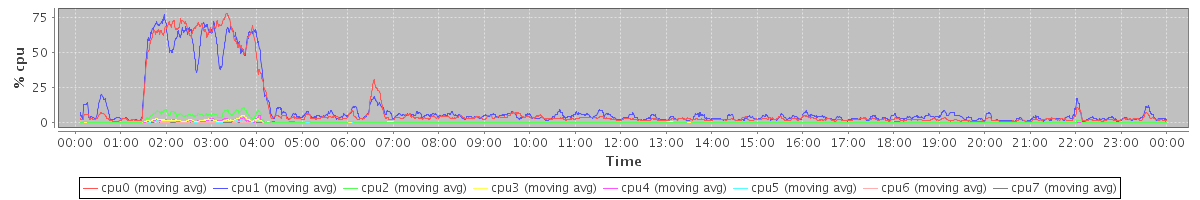 avg(cpu0) = 0.05 avg(cpu1) = 0.05 avg(cpu2) = 0.02 avg(cpu3) = 0.01 avg(cpu4) = 0.01 avg(cpu5) = 0.01 avg(cpu6) = 0.00 avg(cpu7) = 0.00