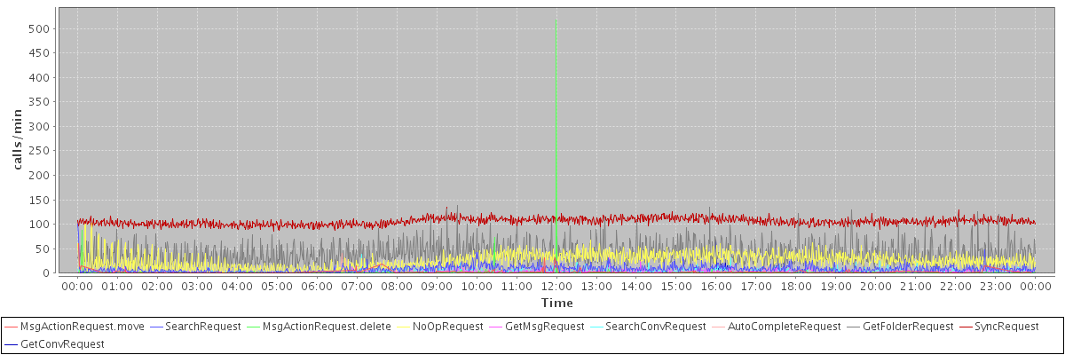 max(MsgActionRequest.move) = 60.00 max(SearchRequest) = 101.00 max(MsgActionRequest.delete) = 518.00 max(NoOpRequest) = 103.00 max(GetMsgRequest) = 38.00 max(SearchConvRequest) = 38.00 max(AutoCompleteRequest) = 40.00 max(GetFolderRequest) = 139.00 max(SyncRequest) = 134.00 max(GetConvRequest) = 68.00