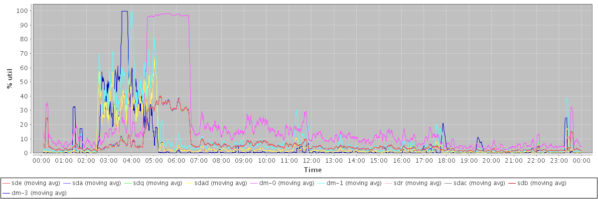 avg(sde) = 6.48 avg(sda) = 6.49 avg(sdq) = 6.51 avg(sdad) = 5.65 avg(dm-0) = 18.43 avg(dm-1) = 9.69 avg(sdr) = 5.64 avg(sdac) = 6.51 avg(sdb) = 5.63 avg(dm-3) = 5.82