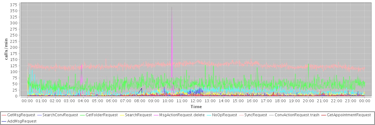 max(GetMsgRequest) = 24.00 max(SearchConvRequest) = 39.00 max(GetFolderRequest) = 132.00 max(SearchRequest) = 112.00 max(MsgActionRequest.delete) = 366.00 max(NoOpRequest) = 121.00 max(SyncRequest) = 154.00 max(ConvActionRequest.trash) = 31.00 max(GetAppointmentRequest) = 33.00 max(AddMsgRequest) = 33.00