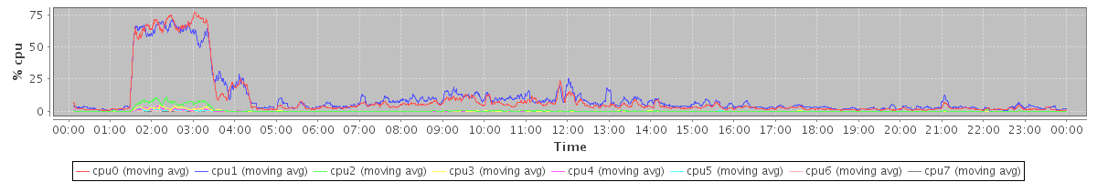 avg(cpu0) = 4.71 avg(cpu1) = 4.38 avg(cpu2) = 2.55 avg(cpu3) = 1.94 avg(cpu4) = 1.59 avg(cpu5) = 1.37 avg(cpu6) = 1.52 avg(cpu7) = 1.12