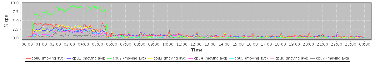 avg(cpu0) = 1.12 avg(cpu1) = 0.89 avg(cpu2) = 1.98 avg(cpu3) = 0.80 avg(cpu4) = 0.67 avg(cpu5) = 0.48 avg(cpu6) = 0.42 avg(cpu7) = 0.26