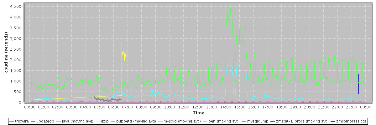 avg(tripwire) = 1713.00 avg(updatedb) = 21.01 avg(java) = 1229.25 avg(gzip) = 2121.58 avg(puppetd) = 11.22 avg(mysqld) = 304.49 avg(perl) = 10.26 avg(mysqldump) = 128.09 avg(zmstat-allprocs) = 10.66 avg(zmcompresslogs) = 911.00