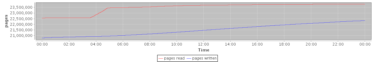 avg(pages read) = 23484820.49 avg(pages written) = 21491346.04
