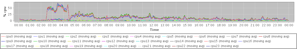 avg(cpu0) = 12.14 avg(cpu1) = 11.10 avg(cpu2) = 0.47 avg(cpu3) = 0.43 avg(cpu4) = 0.27 avg(cpu5) = 0.18 avg(cpu6) = 0.11 avg(cpu7) = 11.95 avg(cpu8) = 0.10 avg(cpu9) = 0.08 avg(cpu10) = 13.22 avg(cpu11) = 0.01 avg(cpu12) = 0.77 avg(cpu13) = 0.85 avg(cpu14) = 0.40 avg(cpu15) = 0.44 avg(cpu16) = 0.34 avg(cpu17) = 0.35 avg(cpu18) = 0.34 avg(cpu19) = 1.04 avg(cpu20) = 0.43 avg(cpu21) = 0.02 avg(cpu22) = 0.72 avg(cpu23) = 0.01