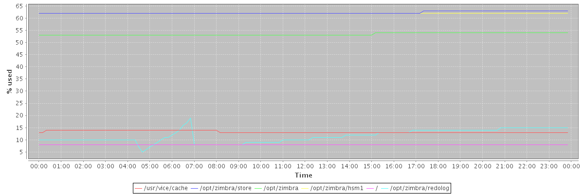 avg(/usr/vice/cache) = 13.33 avg(/opt/zimbra/store) = 62.28 avg(/opt/zimbra) = 53.37 avg(/opt/zimbra/hsm1) = 62.00 avg(/) = 8.00 avg(/opt/zimbra/redolog) = 11.54