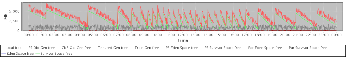 avg(total free) = 3679.51 avg(PS Old Gen free) = 0.00 avg(CMS Old Gen free) = 2763.12 avg(Tenured Gen free) = 0.00 avg(Train Gen free) = 0.00 avg(PS Eden Space free) = 0.00 avg(PS Survivor Space free) = 0.00 avg(Par Eden Space free) = 806.81 avg(Par Survivor Space free) = 109.57 avg(Eden Space free) = 0.00 avg(Survivor Space free) = 0.00