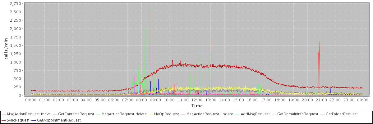 max(MsgActionRequest.move) = 1618.00 max(GetContactsRequest) = 447.00 max(MsgActionRequest.delete) = 2654.00 max(NoOpRequest) = 288.00 max(MsgActionRequest.update) = 587.00 max(AddMsgRequest) = 279.00 max(GetDomainInfoRequest) = 317.00 max(GetFolderRequest) = 270.00 max(SyncRequest) = 1049.00 max(GetAppointmentRequest) = 495.00