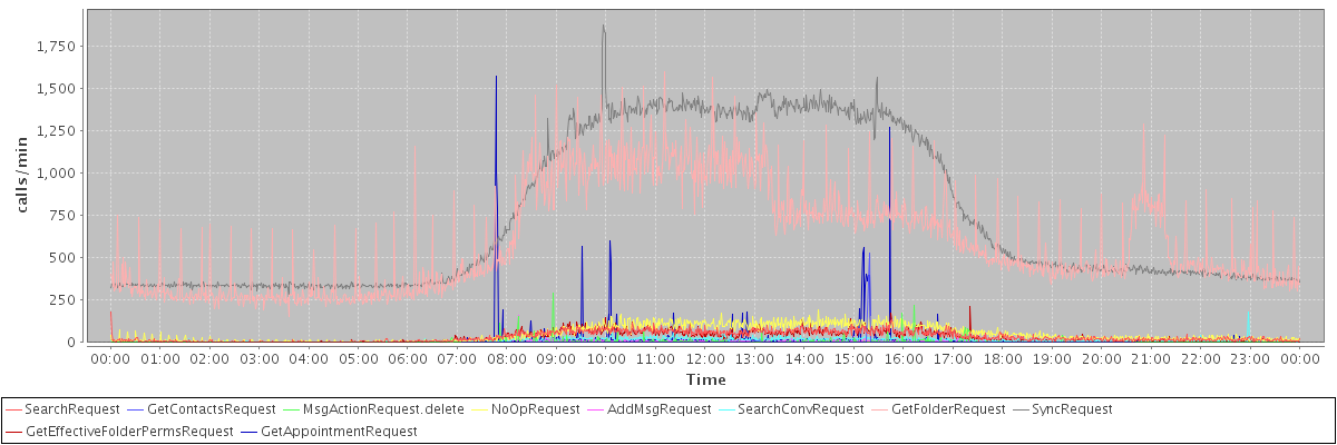 max(SearchRequest) = 182.00 max(GetContactsRequest) = 529.00 max(MsgActionRequest.delete) = 293.00 max(NoOpRequest) = 192.00 max(AddMsgRequest) = 160.00 max(SearchConvRequest) = 181.00 max(GetFolderRequest) = 1598.00 max(SyncRequest) = 1879.00 max(GetEffectiveFolderPermsRequest) = 215.00 max(GetAppointmentRequest) = 1577.00