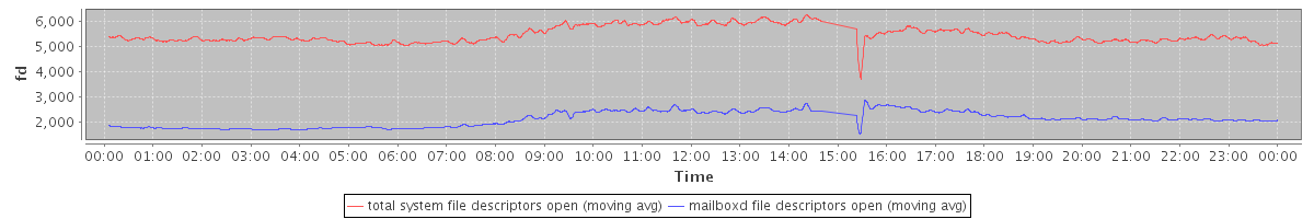 avg(total system file descriptors open) = 5472.43 avg(mailboxd file descriptors open) = 2134.47