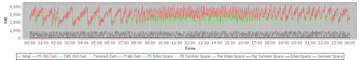 avg(total) = 3031.19 avg(PS Old Gen) = 0.00 avg(CMS Old Gen) = 2454.92 avg(Tenured Gen) = 0.00 avg(Train Gen) = 0.00 avg(PS Eden Space) = 0.00 avg(PS Survivor Space) = 0.00 avg(Par Eden Space) = 498.59 avg(Par Survivor Space) = 77.69 avg(Eden Space) = 0.00 avg(Survivor Space) = 0.00