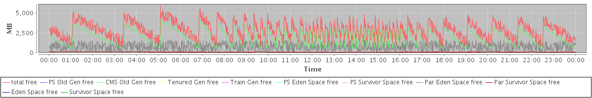 avg(total free) = 2849.84 avg(PS Old Gen free) = 0.00 avg(CMS Old Gen free) = 1967.69 avg(Tenured Gen free) = 0.00 avg(Train Gen free) = 0.00 avg(PS Eden Space free) = 0.00 avg(PS Survivor Space free) = 0.00 avg(Par Eden Space free) = 784.24 avg(Par Survivor Space free) = 97.90 avg(Eden Space free) = 0.00 avg(Survivor Space free) = 0.00