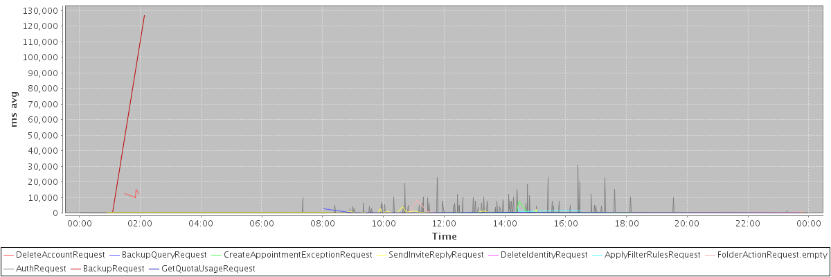 avg(DeleteAccountRequest) = 12673.25 avg(BackupQueryRequest) = 697.40 avg(CreateAppointmentExceptionRequest) = 595.00 avg(SendInviteReplyRequest) = 526.50 avg(DeleteIdentityRequest) = 639.00 avg(ApplyFilterRulesRequest) = 2126.67 avg(FolderActionRequest.empty) = 846.50 avg(AuthRequest) = 550.44 avg(BackupRequest) = 63488.00 avg(GetQuotaUsageRequest) = 2852.00