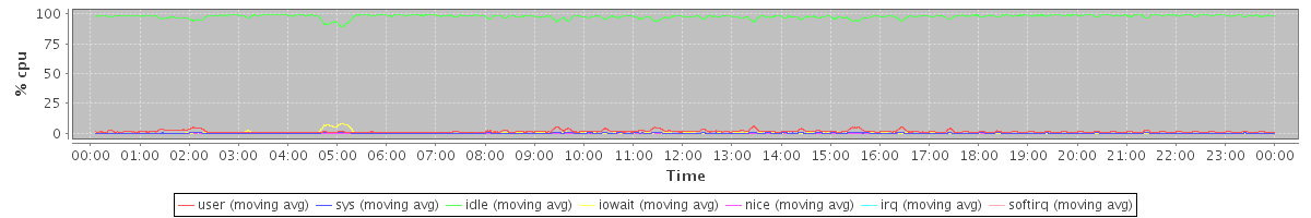 avg(user) = 1.47 avg(sys) = 0.21 avg(idle) = 97.74 avg(iowait) = 0.49 avg(nice) = 0.10 avg(irq) = 0.00 avg(softirq) = 0.00
