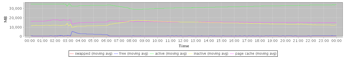 avg(swapped) = 4.63 avg(free) = 766.38 avg(active) = 32411.35 avg(inactive) = 13762.02 avg(page cache) = 15603.25