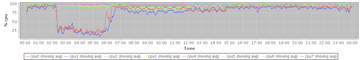 avg(cpu0) = 12.40 avg(cpu1) = 16.37 avg(cpu2) = 0.89 avg(cpu3) = 0.51 avg(cpu4) = 0.19 avg(cpu5) = 0.28 avg(cpu6) = 0.05 avg(cpu7) = 0.11