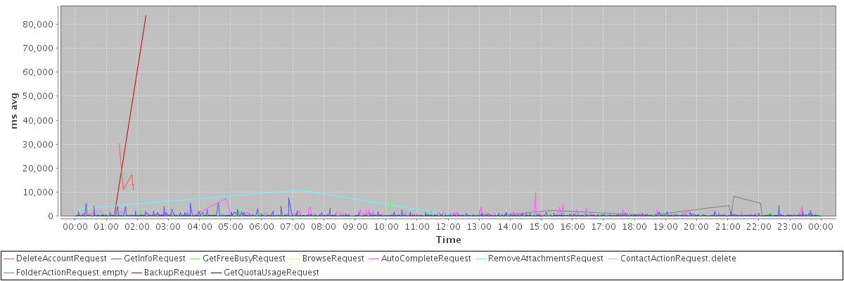 avg(DeleteAccountRequest) = 16066.57 avg(GetInfoRequest) = 404.09 avg(GetFreeBusyRequest) = 347.48 avg(BrowseRequest) = 1540.00 avg(AutoCompleteRequest) = 502.13 avg(RemoveAttachmentsRequest) = 2870.00 avg(ContactActionRequest.delete) = 314.00 avg(FolderActionRequest.empty) = 1465.56 avg(BackupRequest) = 41859.00 avg(GetQuotaUsageRequest) = 1717.00
