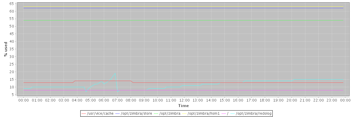 avg(/usr/vice/cache) = 13.18 avg(/opt/zimbra/store) = 62.00 avg(/opt/zimbra) = 54.00 avg(/opt/zimbra/hsm1) = 63.00 avg(/) = 8.00 avg(/opt/zimbra/redolog) = 11.79