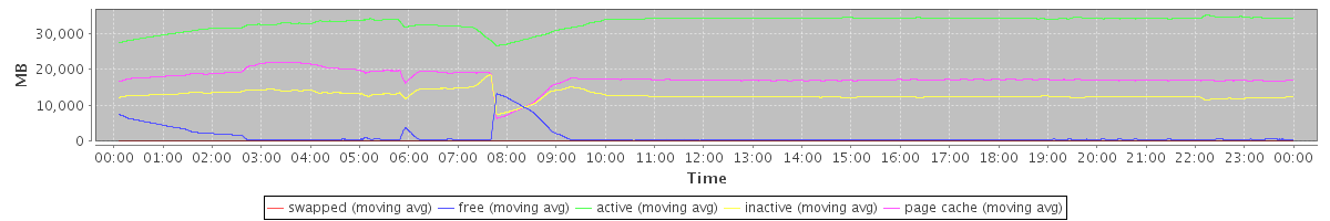 avg(swapped) = 3.19 avg(free) = 1233.15 avg(active) = 33000.13 avg(inactive) = 12758.98 avg(page cache) = 17428.41