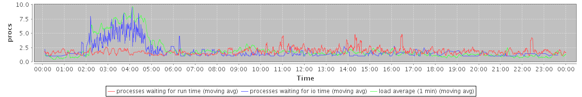 avg(processes waiting for run time) = 1.16 avg(processes waiting for io time) = 0.82 avg(load average (1 min)) = 2.12