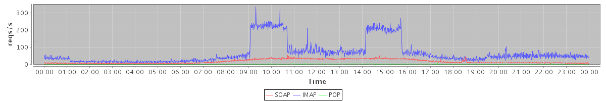 Host zm03.stanford.edu: Mailboxd: Request Rate by Client Protocol