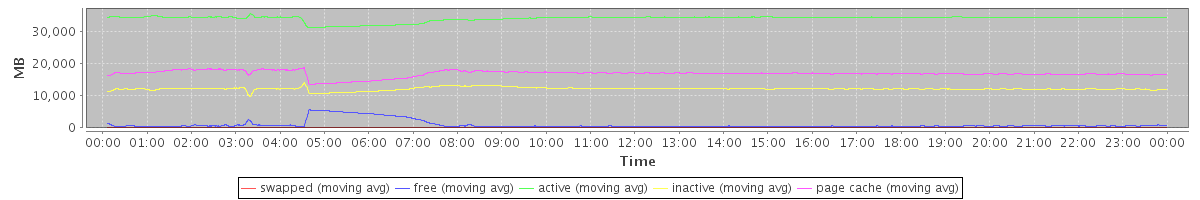 avg(swapped) = 6.38 avg(free) = 930.69 avg(active) = 34022.98 avg(inactive) = 12116.45 avg(page cache) = 16859.65