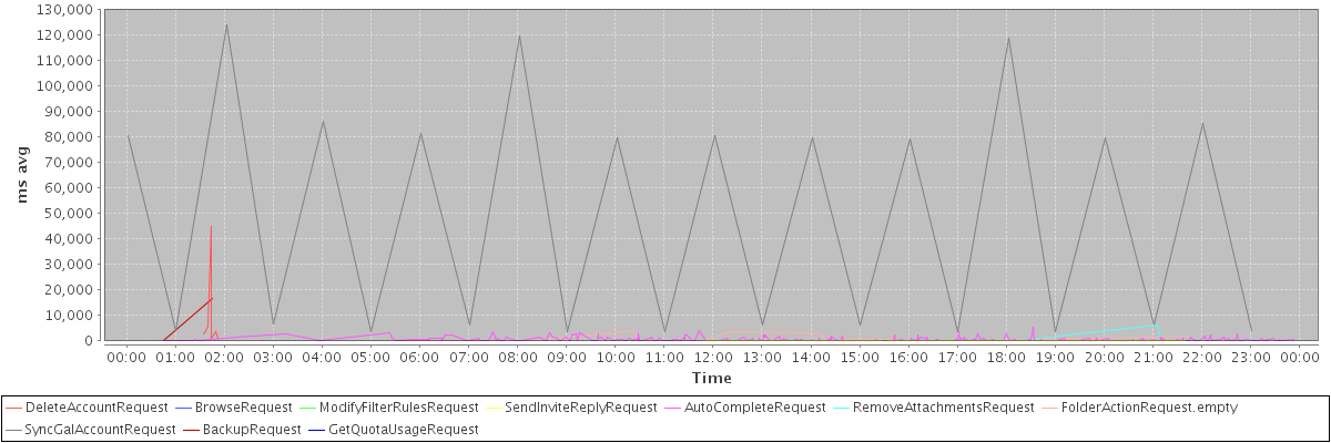 avg(DeleteAccountRequest) = 8897.29 avg(BrowseRequest) = 1109.00 avg(ModifyFilterRulesRequest) = 260.75 avg(SendInviteReplyRequest) = 225.33 avg(AutoCompleteRequest) = 481.86 avg(RemoveAttachmentsRequest) = 2643.00 avg(FolderActionRequest.empty) = 788.63 avg(SyncGalAccountRequest) = 48069.21 avg(BackupRequest) = 8308.00 avg(GetQuotaUsageRequest) = 1350.00