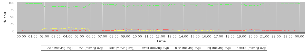 avg(user) = 3.34 avg(sys) = 0.53 avg(idle) = 93.02 avg(iowait) = 2.94 avg(nice) = 0.10 avg(irq) = 0.00 avg(softirq) = 0.08