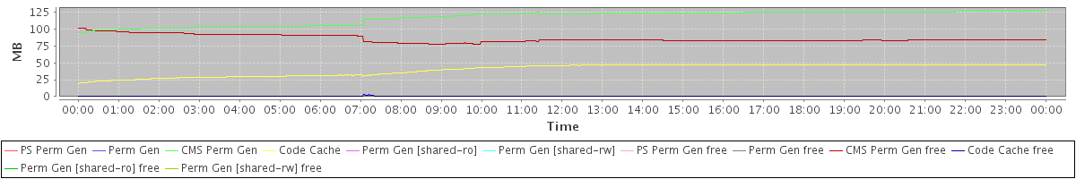avg(PS Perm Gen) = 0.00 avg(Perm Gen) = 0.00 avg(CMS Perm Gen) = 117.46 avg(Code Cache) = 40.26 avg(Perm Gen [shared-ro]) = 0.00 avg(Perm Gen [shared-rw]) = 0.00 avg(PS Perm Gen free) = 0.00 avg(Perm Gen free) = 0.00 avg(CMS Perm Gen free) = 85.86 avg(Code Cache free) = 0.39 avg(Perm Gen [shared-ro] free) = 0.00 avg(Perm Gen [shared-rw] free) = 0.00