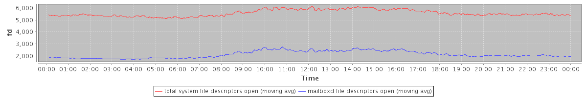 avg(total system file descriptors open) = 5565.88 avg(mailboxd file descriptors open) = 2129.45