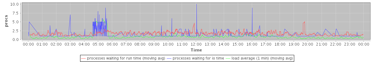avg(processes waiting for run time) = 1.05 avg(processes waiting for io time) = 0.25 avg(load average (1 min)) = 0.89