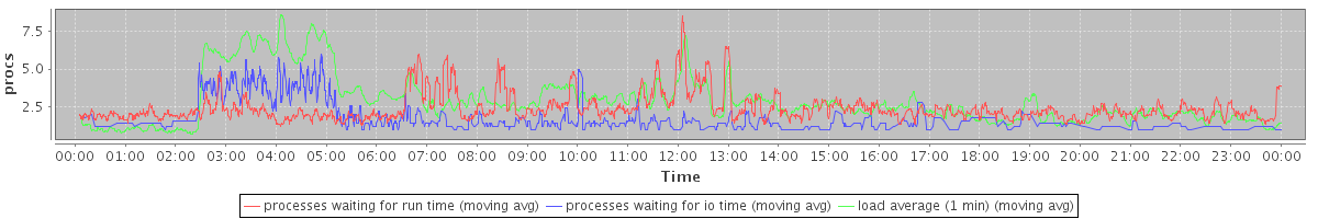 avg(processes waiting for run time) = 2.01 avg(processes waiting for io time) = 0.86 avg(load average (1 min)) = 2.86