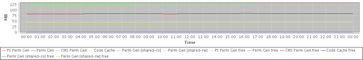 avg(PS Perm Gen) = 0.00 avg(Perm Gen) = 0.00 avg(CMS Perm Gen) = 127.63 avg(Code Cache) = 46.02 avg(Perm Gen [shared-ro]) = 0.00 avg(Perm Gen [shared-rw]) = 0.00 avg(PS Perm Gen free) = 0.00 avg(Perm Gen free) = 0.00 avg(CMS Perm Gen free) = 84.35 avg(Code Cache free) = 0.43 avg(Perm Gen [shared-ro] free) = 0.00 avg(Perm Gen [shared-rw] free) = 0.00