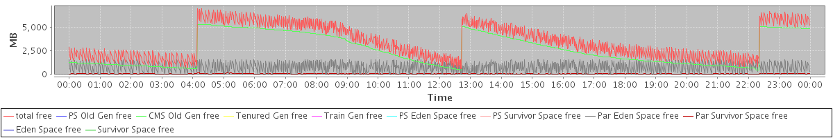 avg(total free) = 3497.78 avg(PS Old Gen free) = 0.00 avg(CMS Old Gen free) = 2642.90 avg(Tenured Gen free) = 0.00 avg(Train Gen free) = 0.00 avg(PS Eden Space free) = 0.00 avg(PS Survivor Space free) = 0.00 avg(Par Eden Space free) = 788.56 avg(Par Survivor Space free) = 66.32 avg(Eden Space free) = 0.00 avg(Survivor Space free) = 0.00