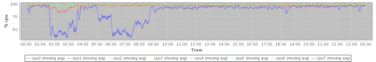 avg(cpu0) = 0.55 avg(cpu1) = 12.18 avg(cpu2) = 0.18 avg(cpu3) = 0.19 avg(cpu4) = 0.17 avg(cpu5) = 0.04 avg(cpu6) = 0.03 avg(cpu7) = 0.07