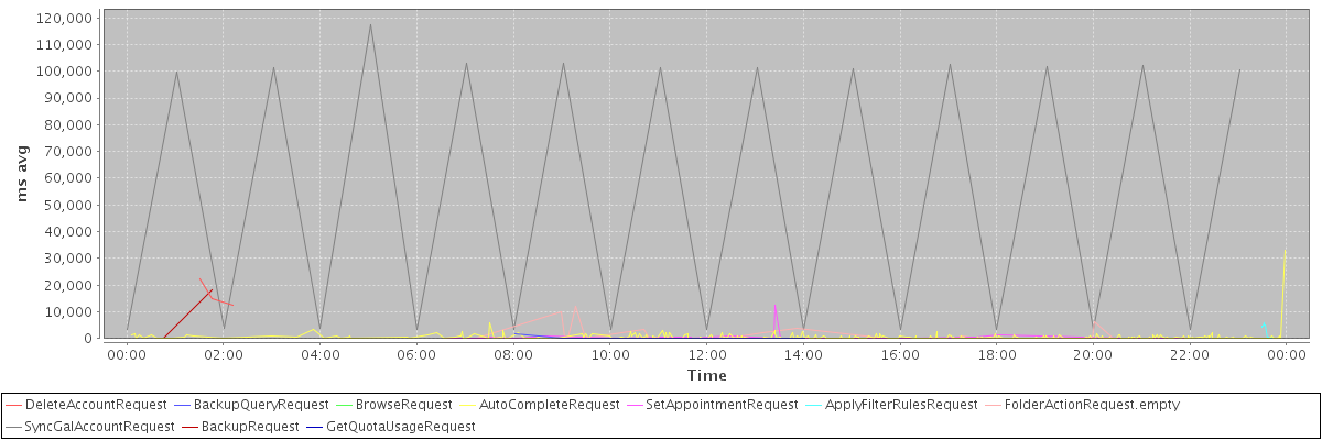 avg(DeleteAccountRequest) = 16601.67 avg(BackupQueryRequest) = 444.33 avg(BrowseRequest) = 720.00 avg(AutoCompleteRequest) = 550.01 avg(SetAppointmentRequest) = 623.97 avg(ApplyFilterRulesRequest) = 2838.55 avg(FolderActionRequest.empty) = 1892.88 avg(SyncGalAccountRequest) = 53250.38 avg(BackupRequest) = 9283.50 avg(GetQuotaUsageRequest) = 2791.00
