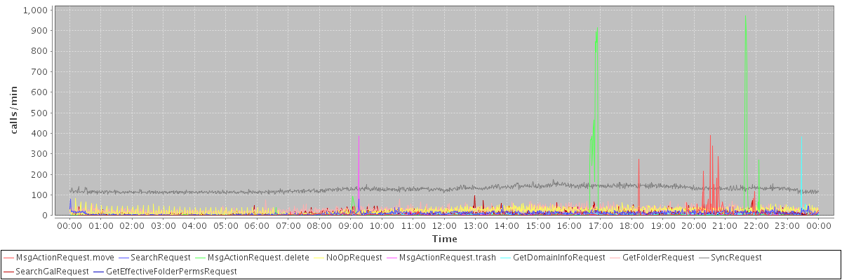 max(MsgActionRequest.move) = 390.00 max(SearchRequest) = 80.00 max(MsgActionRequest.delete) = 973.00 max(NoOpRequest) = 82.00 max(MsgActionRequest.trash) = 387.00 max(GetDomainInfoRequest) = 383.00 max(GetFolderRequest) = 79.00 max(SyncRequest) = 175.00 max(SearchGalRequest) = 95.00 max(GetEffectiveFolderPermsRequest) = 54.00