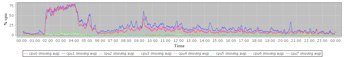 avg(cpu0) = 0.60 avg(cpu1) = 0.36 avg(cpu2) = 0.75 avg(cpu3) = 0.36 avg(cpu4) = 0.35 avg(cpu5) = 0.24 avg(cpu6) = 0.31 avg(cpu7) = 0.14