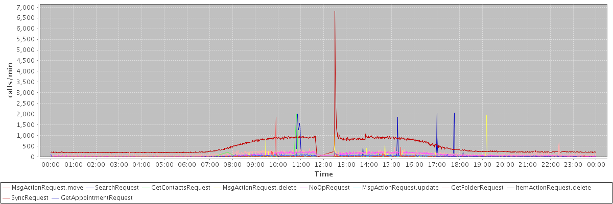max(MsgActionRequest.move) = 1853.00 max(SearchRequest) = 305.00 max(GetContactsRequest) = 2014.00 max(MsgActionRequest.delete) = 1956.00 max(NoOpRequest) = 322.00 max(MsgActionRequest.update) = 204.00 max(GetFolderRequest) = 677.00 max(ItemActionRequest.delete) = 232.00 max(SyncRequest) = 6805.00 max(GetAppointmentRequest) = 2051.00