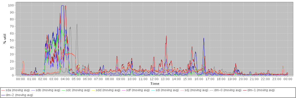 avg(sda) = 6.43 avg(sdb) = 5.10 avg(sdc) = 4.21 avg(sdd) = 6.50 avg(sdf) = 5.11 avg(sdi) = 6.52 avg(sdj) = 5.10 avg(dm-0) = 5.28 avg(dm-1) = 9.81 avg(dm-2) = 6.50