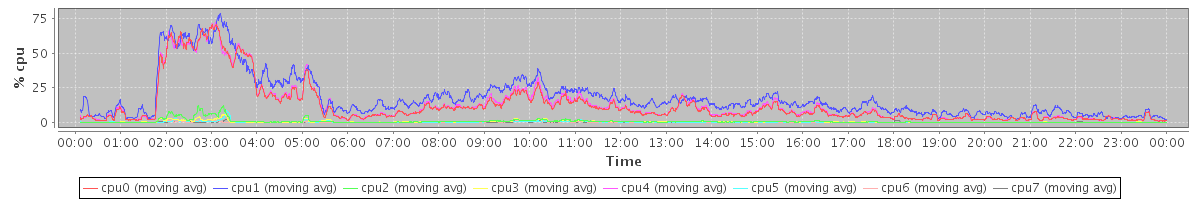 avg(cpu0) = 0.97 avg(cpu1) = 1.15 avg(cpu2) = 0.62 avg(cpu3) = 0.85 avg(cpu4) = 0.65 avg(cpu5) = 0.48 avg(cpu6) = 0.27 avg(cpu7) = 0.30
