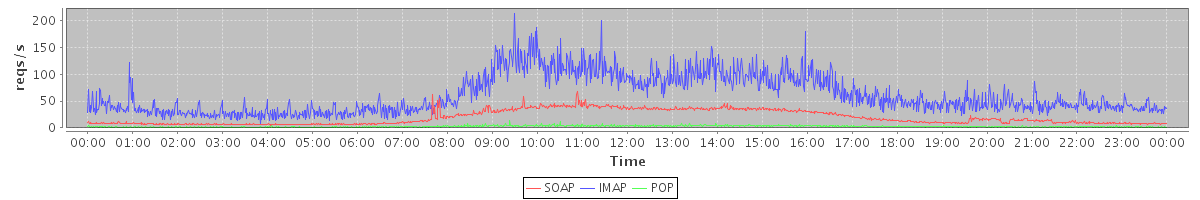 Host zm04.stanford.edu: Mailboxd: Request Rate by Client Protocol