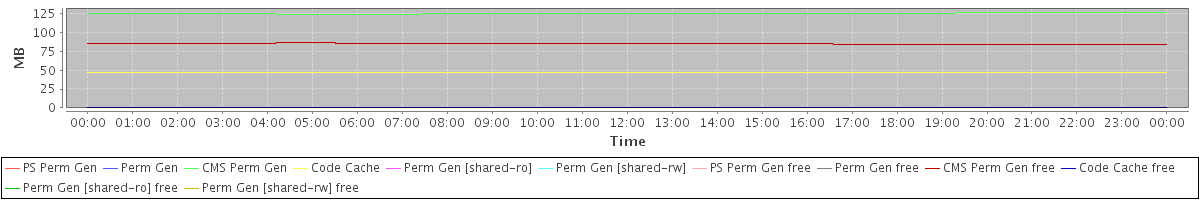 avg(PS Perm Gen) = 0.00 avg(Perm Gen) = 0.00 avg(CMS Perm Gen) = 125.44 avg(Code Cache) = 47.51 avg(Perm Gen [shared-ro]) = 0.00 avg(Perm Gen [shared-rw]) = 0.00 avg(PS Perm Gen free) = 0.00 avg(Perm Gen free) = 0.00 avg(CMS Perm Gen free) = 85.04 avg(Code Cache free) = 0.43 avg(Perm Gen [shared-ro] free) = 0.00 avg(Perm Gen [shared-rw] free) = 0.00