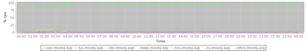 avg(user) = 2.36 avg(sys) = 0.30 avg(idle) = 96.06 avg(iowait) = 1.14 avg(nice) = 0.10 avg(irq) = 0.00 avg(softirq) = 0.01